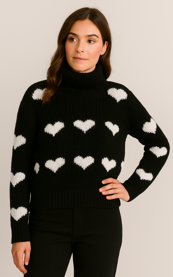 Suéter de cuello alto en tejido grueso y ultra suave, decorado con corazones rojos que aportan un toque romántico y moderno. Su corte cómodo y cálido lo convierte en la prenda ideal para la temporada fría, perfecta para combinar con pantalones, faldas o leggings. Brinda abrigo sin perder estilo, ideal para looks casuales, salidas especiales o outfits de invierno con personalidad.❤️